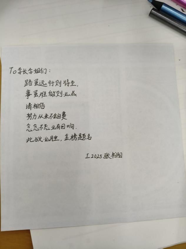 当你们读到这封信时,你们或许刚合上厚厚的练习册,或许刚背完一个知识点。看看时间,这正是考研路上最考验心态也最接近光亮的冲刺时刻。作为学弟学妹,我们一直默默关注着你们——那些清晨图书馆里的身影、深夜走廊轻轻的背书声、笔记本上密密匝匝的笔迹……我们都看在眼里,也记在心里。 我们都知道,这一路并不轻松。书本堆成山,时间总不够用,焦虑像潮水一样时不时涌上心头。有时候,你们也会在某个深夜突然怀疑:我能不能行?这样的付出,真的会有回报吗?可我们想说这些情绪并不可怕,说明你们在乎自己的梦想。请你们相信,现在的每一步,就像一棵树,在地下默默扎根的时光,没人看见,却为破土后的挺拔积蓄力量。